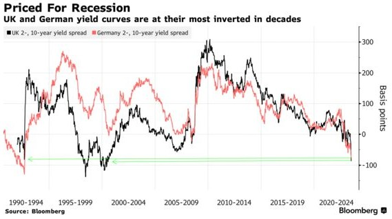 德國兩年期國債的收益率比可比的10年期國債高出逾70個基點,為1992年以來最高。在英國,收益率倒掛超過80個基點,是2000年以來的最高水平。