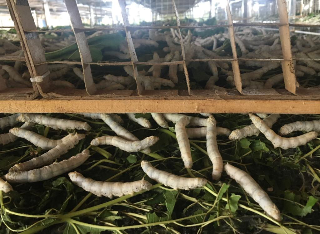 在標準化養(yǎng)蠶車間內(nèi),五齡期大蠶正在啃食桑葉
