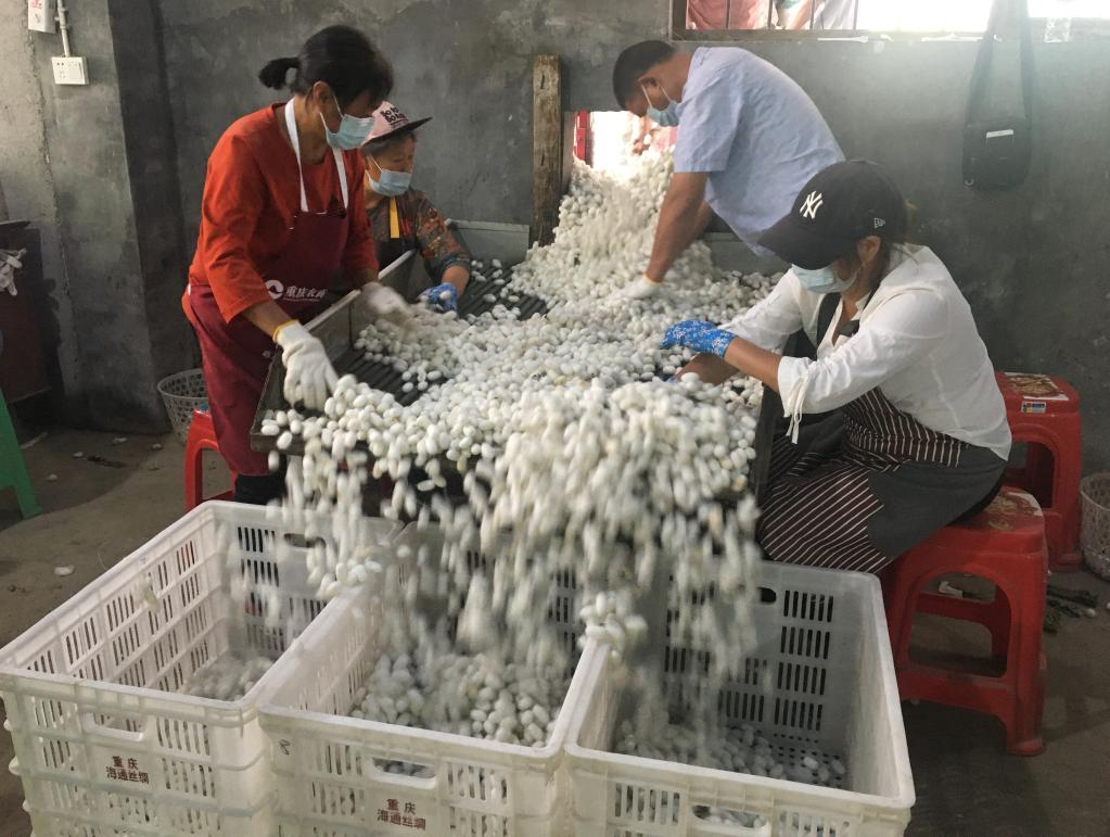 圖為工人們正在太極鎮(zhèn)蠶繭收購站忙碌