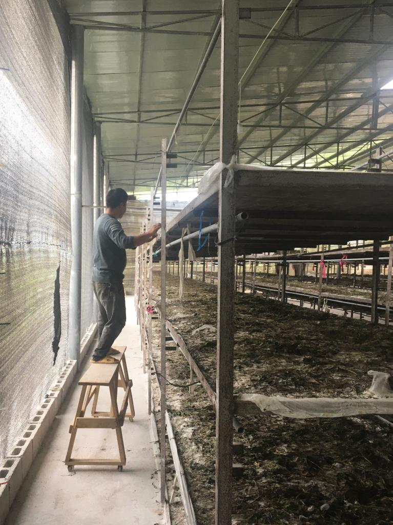 第一季春蠶飼養(yǎng)結(jié)束后,蠶農(nóng)站在自制的“滑凳”上,清理高處的蠶沙