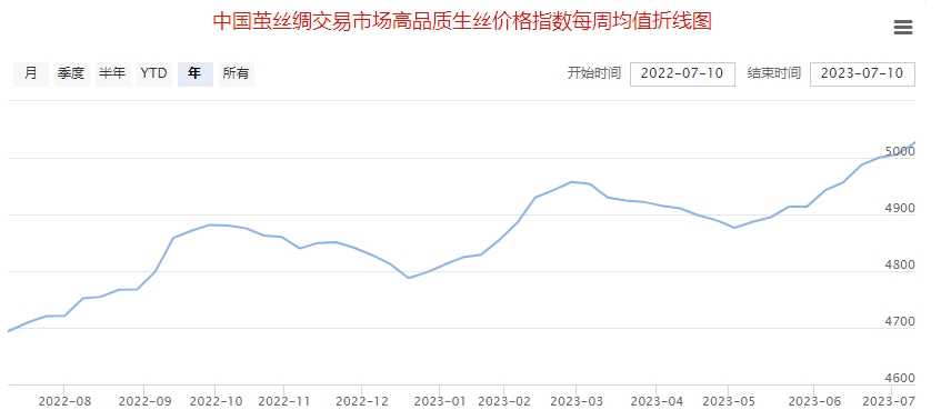 今日(2023年07月14日,周五)中國(guó)繭絲綢交易市場(chǎng)生絲指數(shù)上漲0.53%收于4615.73點(diǎn),本周生絲指數(shù)上漲0.50%。B絲(商檢4A級(jí)生絲):230725合約上漲0.24萬(wàn)元報(bào)收于45.69萬(wàn)元;230925合約上漲0.24萬(wàn)元報(bào)收于45.90萬(wàn)元;240325合約上漲0.45萬(wàn)元報(bào)收于47.22萬(wàn)元。