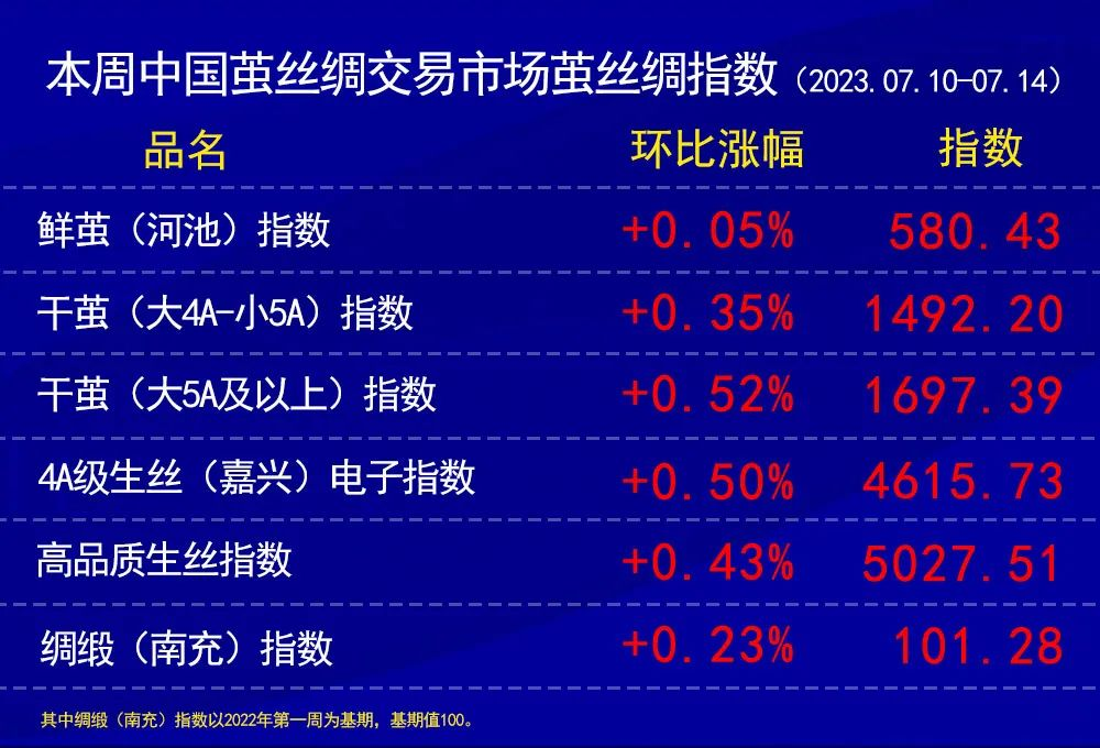 高品質(zhì)生絲指數(shù)上,部分前期持價(jià)觀望的協(xié)作單位本周有所成交,價(jià)格有些上漲。整體上,高品質(zhì)生絲價(jià)格指數(shù)環(huán)比上周上漲0.43%。