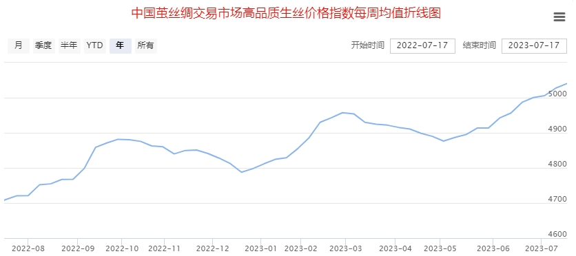 相對(duì)于對(duì)印度市場(chǎng)的生絲出口較前期顯得清淡,進(jìn)入7月中下旬,織造企業(yè)為秋季生產(chǎn)的備原料的生絲購(gòu)買行為顯得較前期濃厚一些。本周,根據(jù)市場(chǎng)協(xié)作單位上報(bào)生成,高品質(zhì)生絲價(jià)格指數(shù)繼續(xù)整體有上調(diào),環(huán)比上周上漲0.26%報(bào)收于5040.35點(diǎn)。