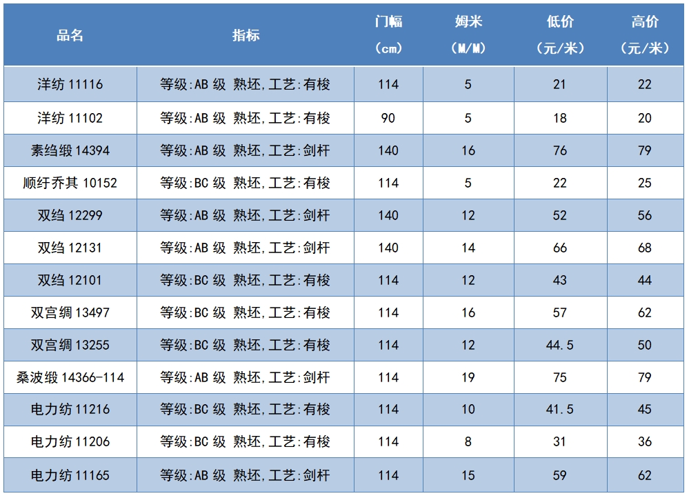 本周綢緞指數(shù)協(xié)作單位成交價(jià)格區(qū)間