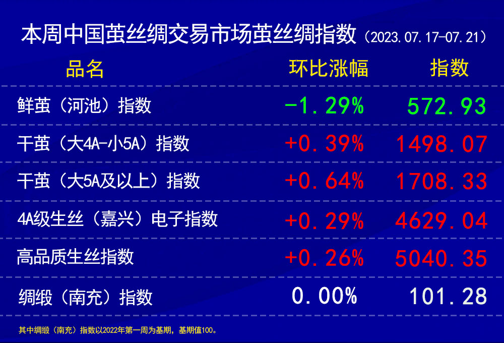 今日(2023年07月21日,周五)中國(guó)繭絲綢交易市場(chǎng)生絲指數(shù)下跌0.18%收于4629.04點(diǎn),本周生絲指數(shù)上漲0.29%。B絲(商檢4A級(jí)生絲):230725合約下跌0.09萬元報(bào)收于45.60萬元;230925合約下跌0.18萬元報(bào)收于45.93萬元;240325合約下跌0.21萬元報(bào)收于47.31萬元。