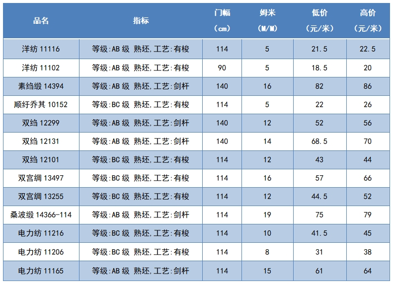 本周綢緞指數(shù)協(xié)作單位成交價格區(qū)間