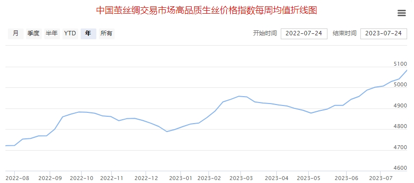 今日(2023年07月28日,周五)中國繭絲綢交易市場生絲指數(shù)微跌0.03%收于4735.95點,本周生絲指數(shù)上漲2.31%。B絲(商檢4A級生絲):230825合約上漲0.09萬元報收于47.07萬元;230925合約下跌0.27萬元報收于47.43萬元;240325合約下跌0.30萬元報收于48.48萬元。