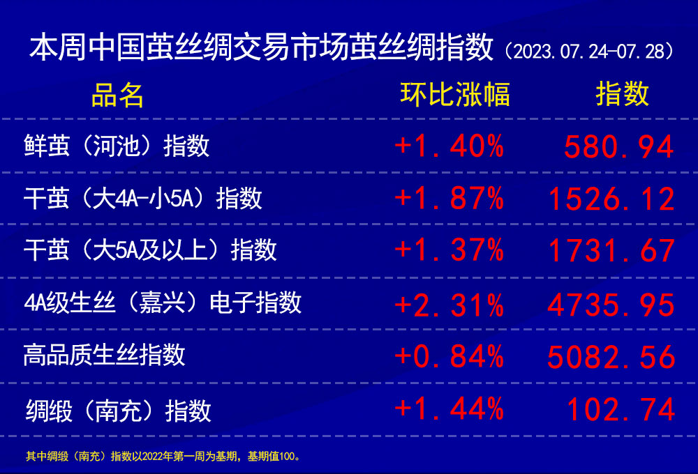 本周生絲副產(chǎn)品和絲綿等價格都有不同幅度價格上調(diào),蠶蛹基本平穩(wěn)。