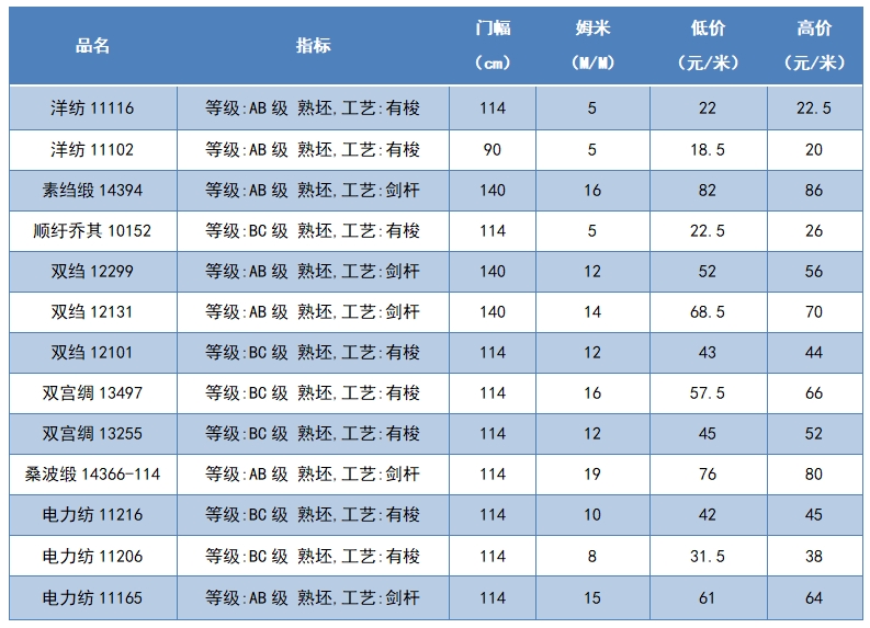 本周綢緞指數(shù)協(xié)作單位成交價格區(qū)間