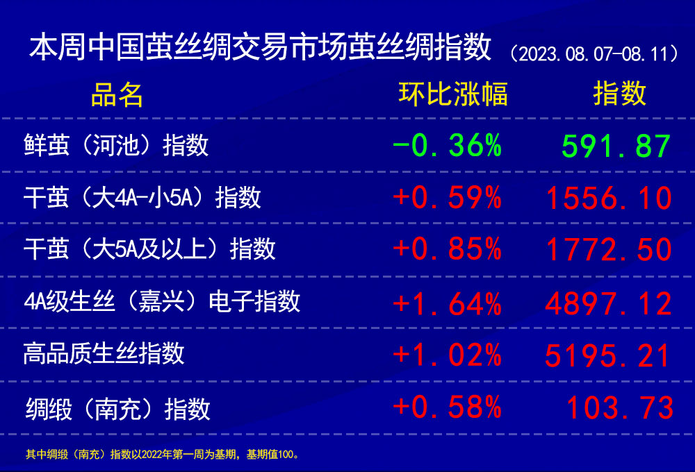 絲價繼續(xù)上漲 本周繭絲綢指數(shù)表現(xiàn)不一(20230811)