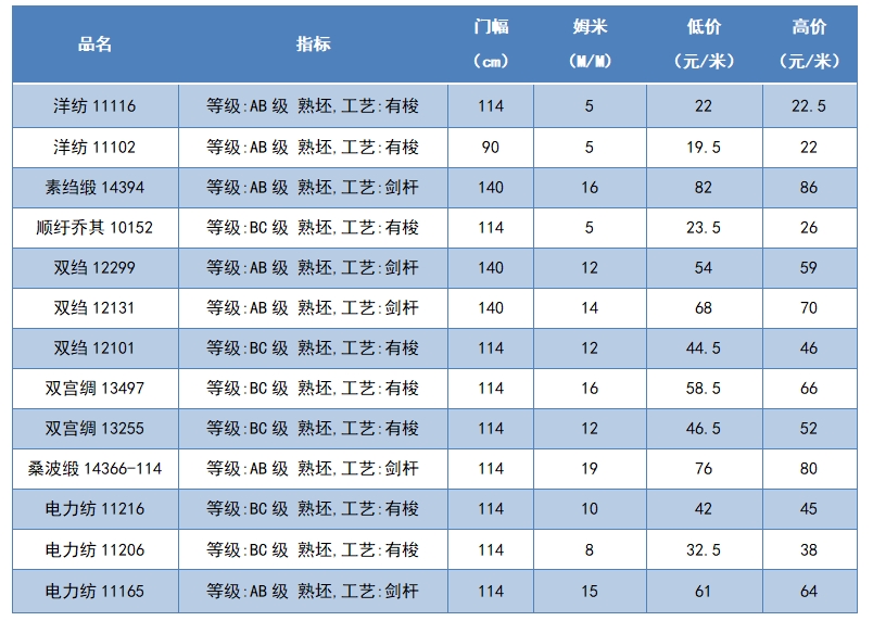 本周綢緞指數(shù)協(xié)作單位成交價格區(qū)間