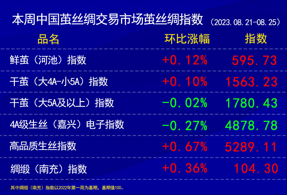 今日(2023年08月25日,周五)中國繭絲綢交易市場生絲指數(shù)下跌0.16%收于4878.78點,本周生絲指數(shù)下跌0.27%。B絲(商檢4A級生絲):230925合約下跌0.03萬元報收于48.96萬元;240325合約下跌0.12萬元報收于48.93萬元;240925合約下跌0.03萬元報收于48.27萬元。
