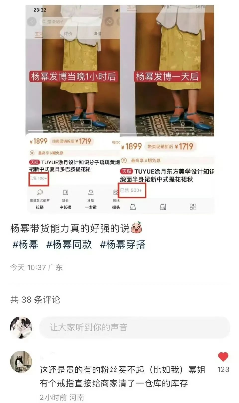今年,各式提花和各式香云紗等局部亮點面料非常流行于線上線下,連楊冪也愛上了這種國潮風。8月24日,”“楊冪的新中式穿搭已賣斷貨話題很快進入微博熱搜。冪式穿搭的好處就是普通人容易復制。這套中式上衣和提花裙的淘寶風搭配立馬受到全國網(wǎng)友追捧,賣斷貨。