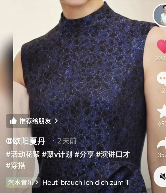 再看下,8月23日,非?;鸬那把胍曋鞒秩藲W陽夏丹的抖音上,她身穿上久楷的宋錦面料的連衣裙上臺,又吸引了一大批粉絲。